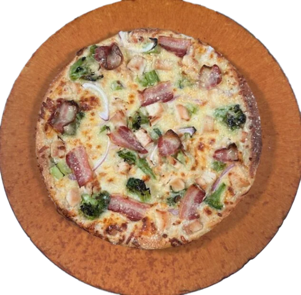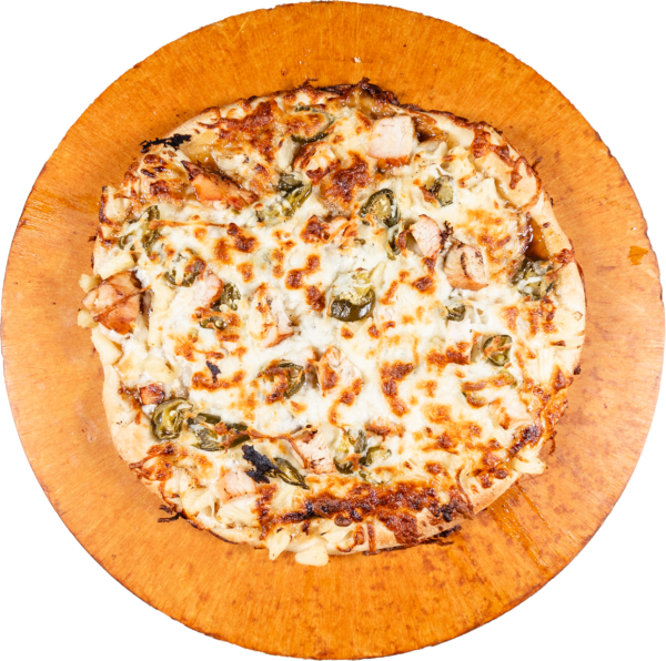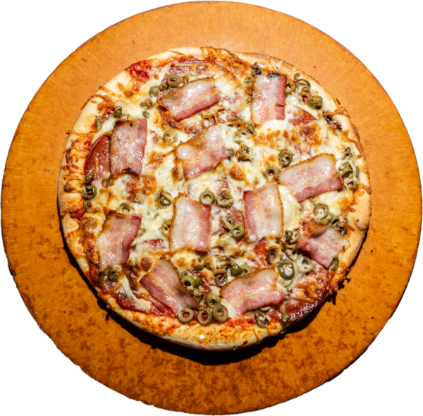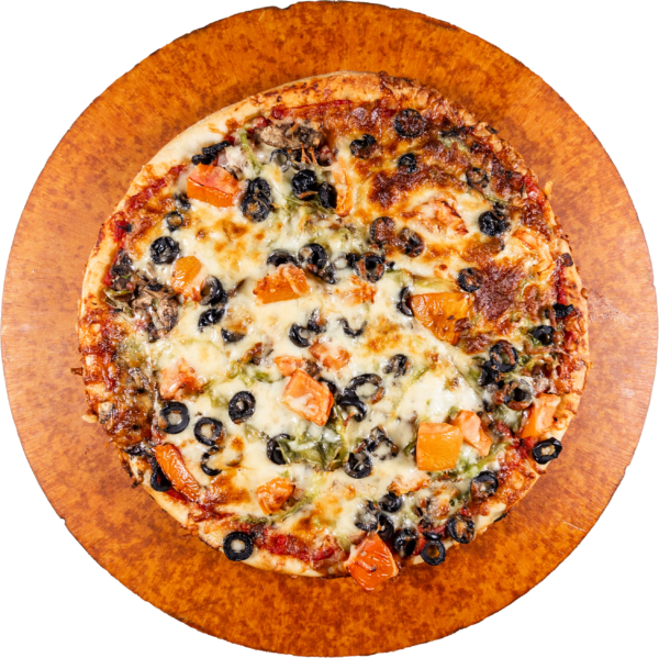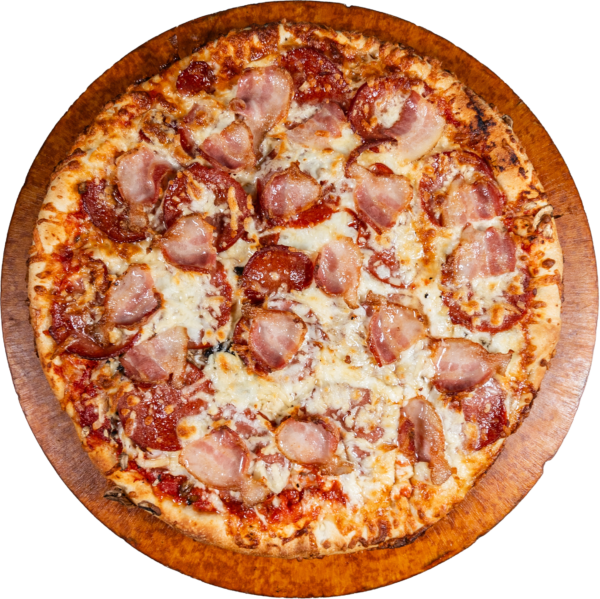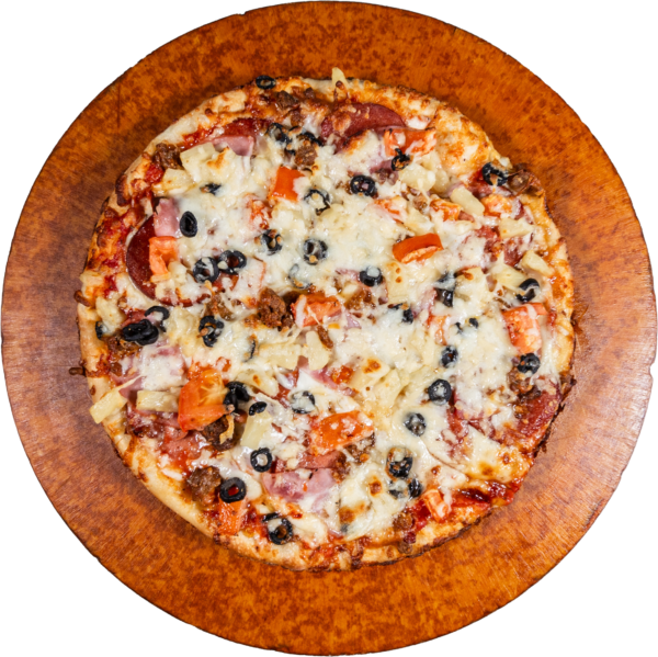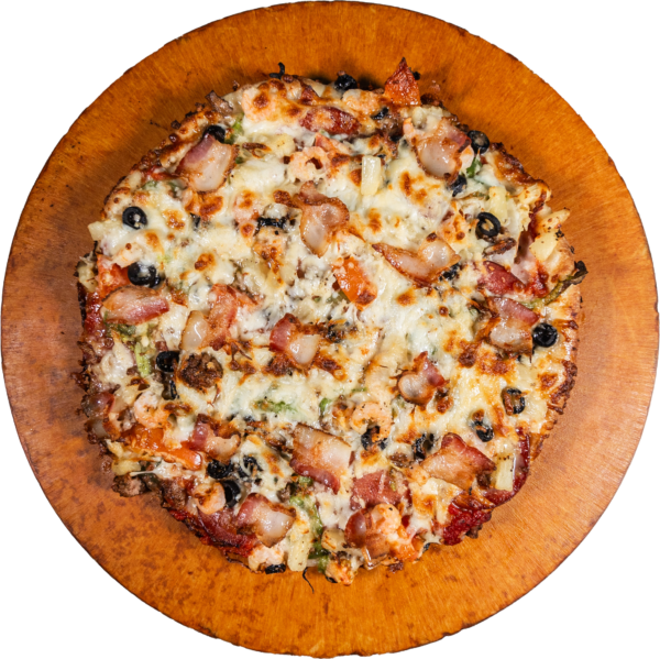 PEPPERONI, MUSHROOMS, HAM, ONIONS, GREEN PEPPERS, SHRIMP, BLACK OLIVES, TOMATOES, PINEAPPLE, GROUND BEEF, SMOKED BACON.