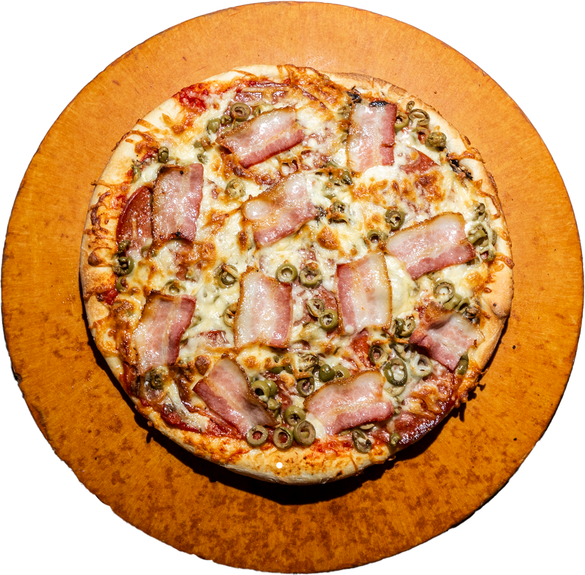 MUSHROOMS, PEPPERONI, GREEN OLIVES, SMOKED BACON