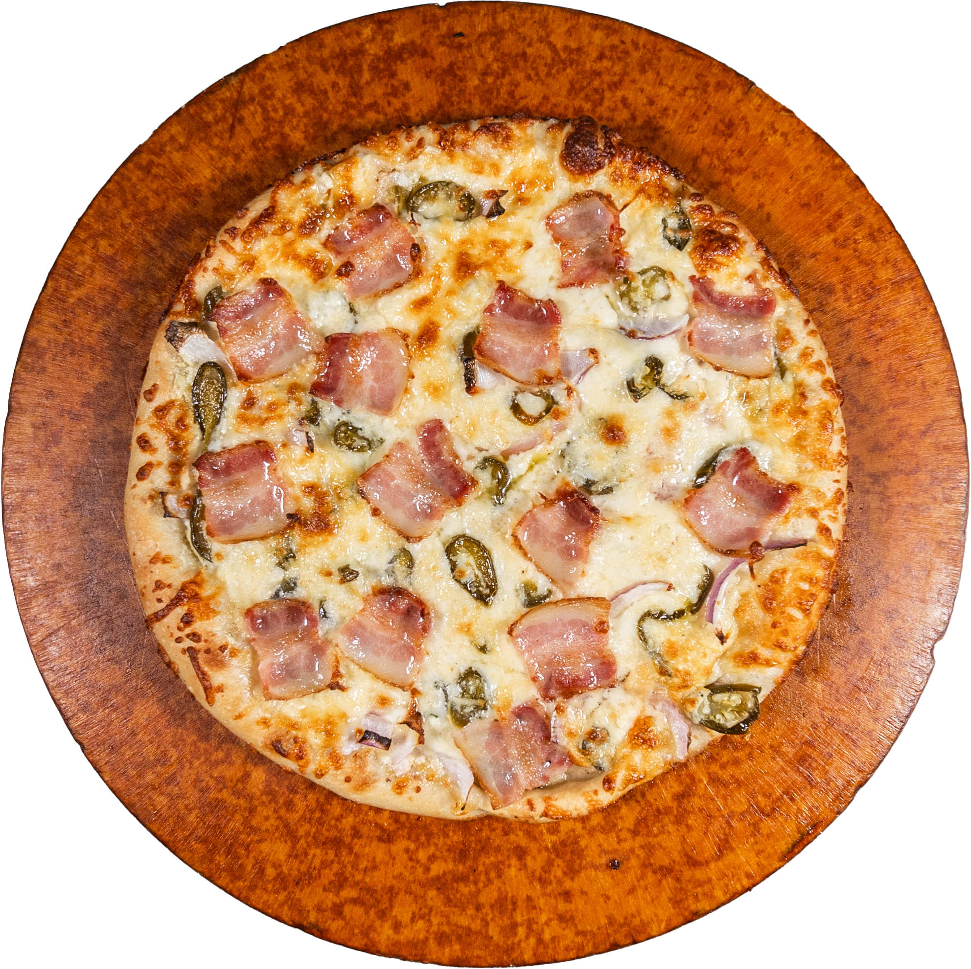 ALFREDO, RED ONIONS, BROCCOLI, CHICKEN, BACON. TOPPED WITH PARMESAN