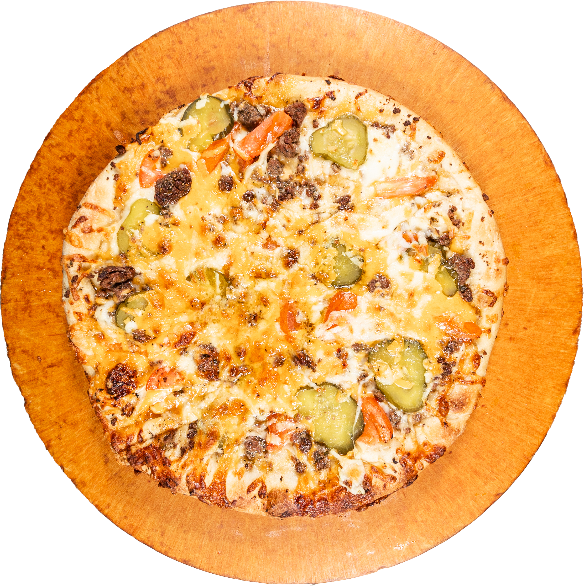 THOUSAND ISLAND DRESSING, ONIONS, GROUND BEEF, DILL PICKLES, TOMATOES, CHEDDAR
